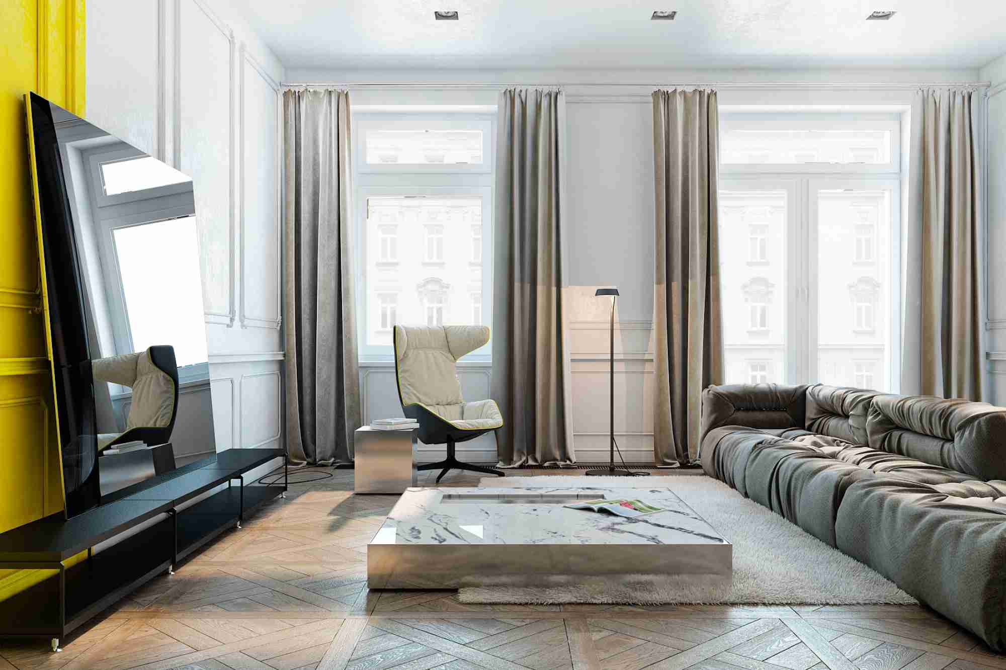 电视柜为主导的收纳型电视墙。因为是整体的柜子,所以电视机可以随意的移动到家中各个角落。电视柜的颜色和家中其他家具和谐一致。