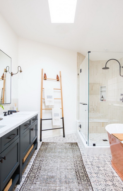 45、 卫生间最好有柜子,可以放些卫生间用品,我家都是开放式的架子,很积灰,最好设计个方便的小书架,蹲坑时可以看书